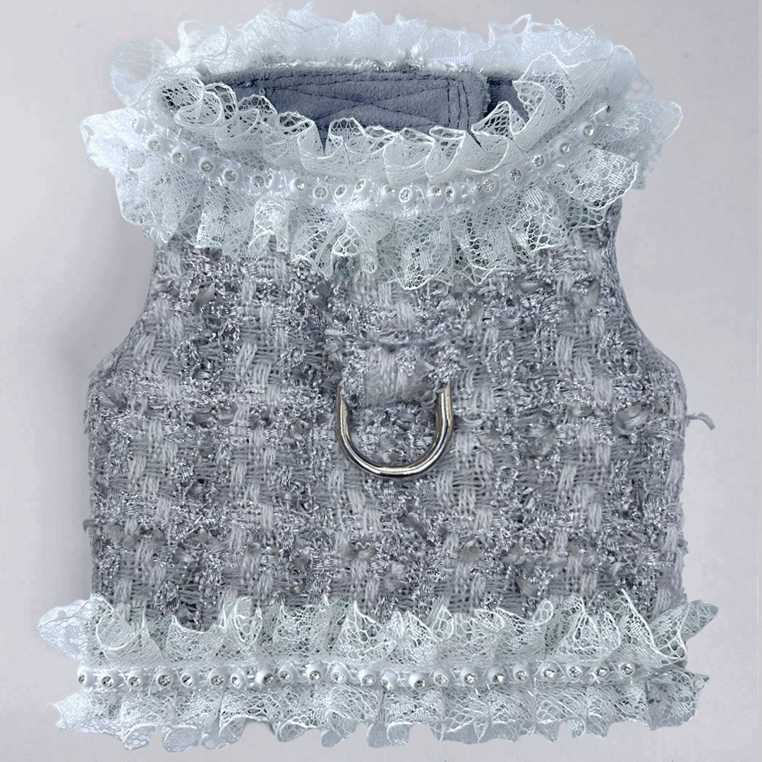 Elevate your pet’s style with our Envogue Dog Harness Collection by Hello Doggie. Each harness is thoughtfully designed, ensuring every baby receives the royal treatment they deserve. From the very selection of fabrics to the intricate piecing together of each harness, no detail is spared in creating these masterpieces. One of the standout features of our luxury dog harnesses is each one has their own unique lace trimming, with a range of classic and trendy styles to choose from, you can find the perfect style to suit your pup's personality and meet their fashion needs. It's not always that luxury items are comfortable, but Hello Doggie prioritizes on comfort and functionality of our harnesses. Thoughtful features such as Velcro straps are easy-to-use fasteners making it a breeze to put on and take off, ensuring a hassle-free experience for both you and your furry baby. When it comes to caring for your luxury dog harness, our high standards extend beyond its creation, to keep the coat looking its best so that your pup can continue to strut their stuff in style, spot clean or wash on delicate, no bleach or softener and air dry. Not only can you elevate your baby’s wardrobe all year round, matching coats for those cold chilly days are also available, sold separately.  *Check Size Chart*  Limited Edition  MSRP $84.00  *Harnesses are handmade sizes may vary slightly. Made in USA.